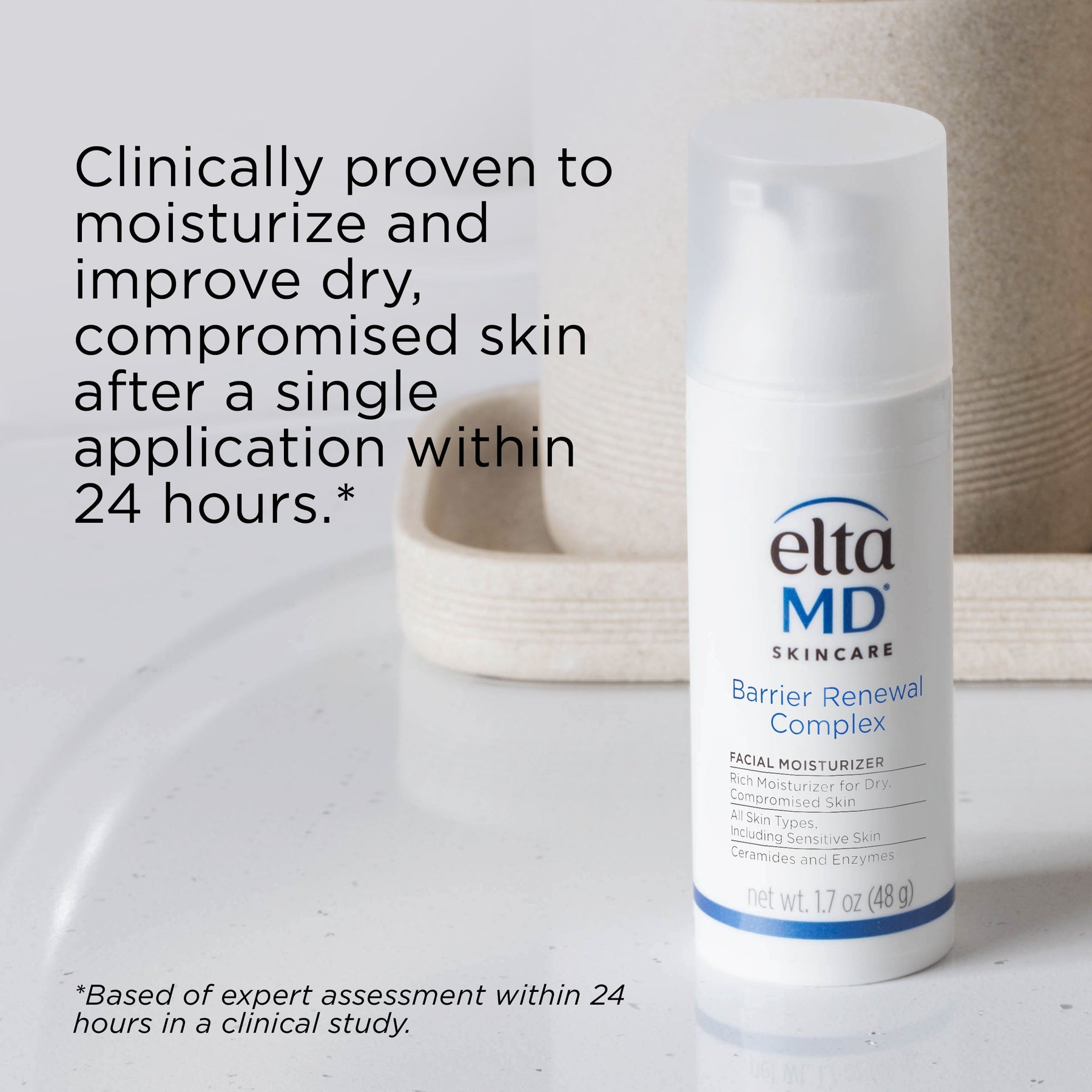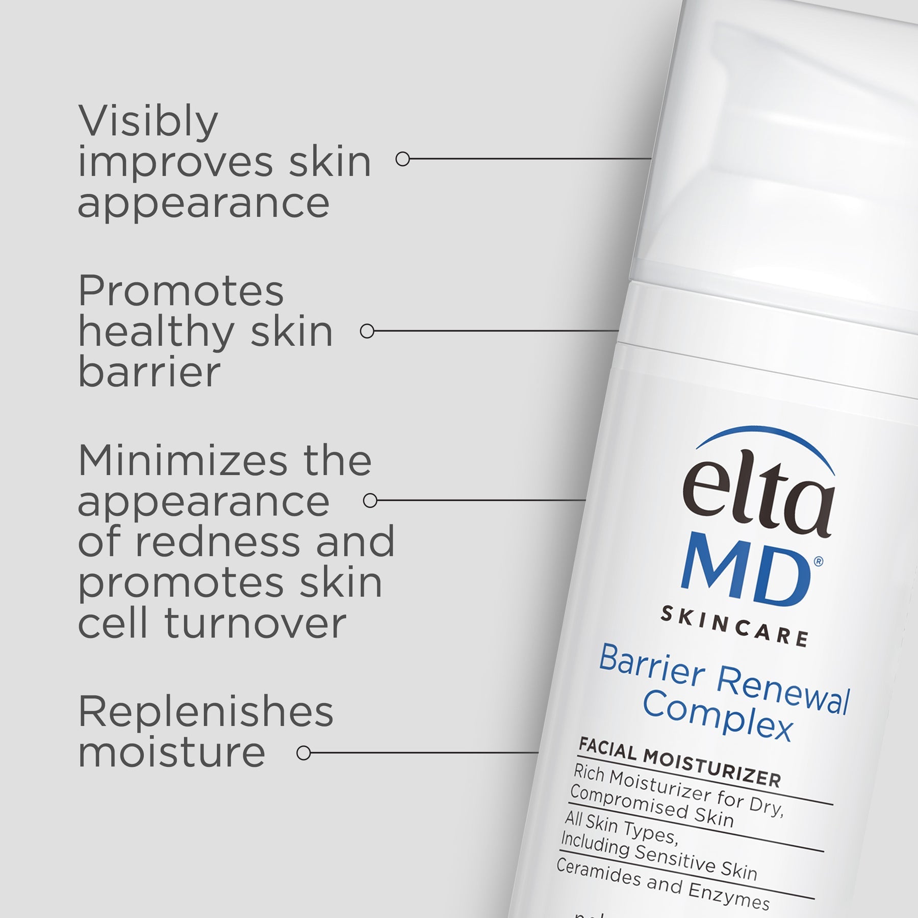 El Complejo Renovador de Barrera EltaMD es una fórmula avanzada que minimiza visiblemente la apariencia de las líneas de expresión y mejora la elasticidad, a la vez que mejora significativamente la textura, el tono y el tamaño de los poros de la piel. Una mezcla selecta de ceramidas y otros lípidos esenciales ayuda a fortalecer la barrera y restaurar su sistema de hidratación natural. Los péptidos ayudan a suavizar las líneas de expresión, mientras que las enzimas y vitaminas promueven una exfoliación suave y minimizan la apariencia de enrojecimiento. Clínicamente probado para hidratar y mejorar la piel seca y dañada después de una sola aplicación en 24 horas.* En 21 días, la piel luce más suave, tersa, saludable y juvenil. No comedogénico, sin fragancia ni parabenos.