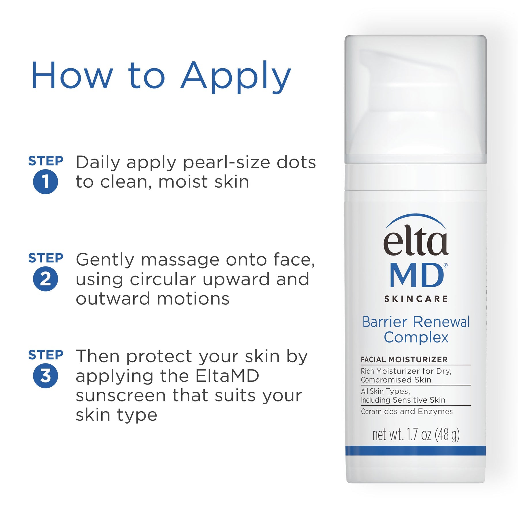- Aplicar diariamente en el rostro después del sérum. Continuar con un protector solar EltaMD adecuado para su tipo de piel durante el día.
